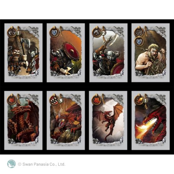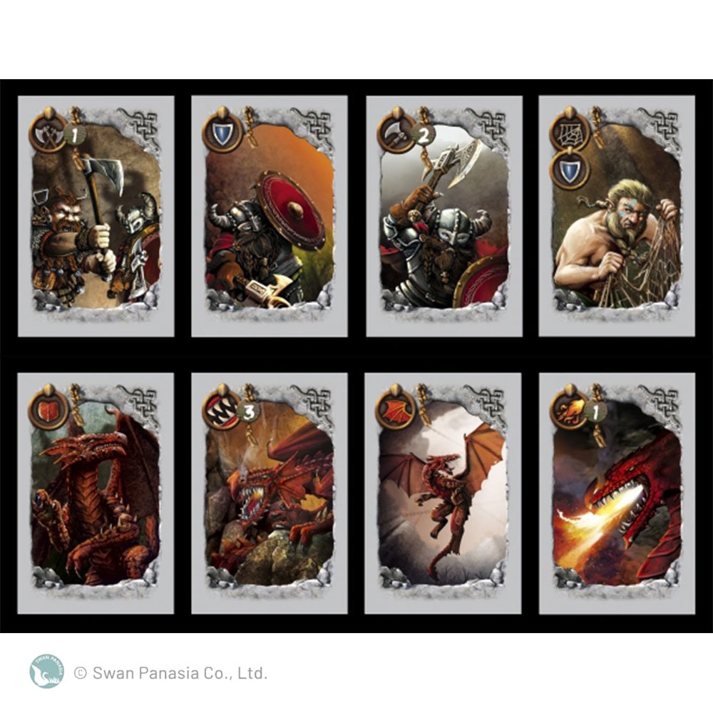 1張地圖板、38張巨龍卡、1張巨龍玩家面板、1個巨龍模型、38張矮人卡、1張矮人玩家面板、3個矮人模型、1個捕龍網指示物、1個狂暴指示物、25個傷害指示物、1本說明書。