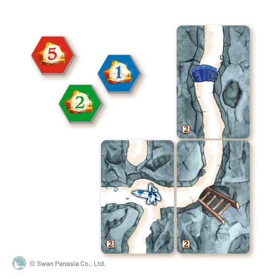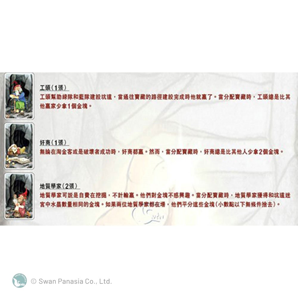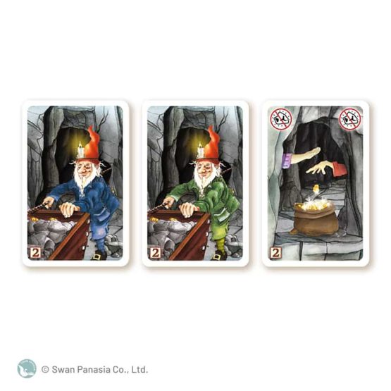 32個金塊、30張路徑卡、21張行動卡、15張矮人卡及1份遊戲說明書。