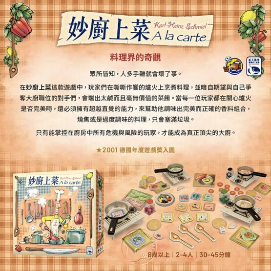 大家都知道,人多手雜就會壞了事。在『妙廚上菜』這款遊戲中,玩家們在嘶嘶作響的爐火上烹煮料理,並暗自期望著與自己爭奪大廚職的對手們,會端出太鹹而且毫無價值的菜餚。當每一位玩家都在關心爐火是否完美時,還必須擁有超越直覺的能力,來幫助他調味出完美而正確的香料組合,而燒焦或是過度調味的料理,只會對塞滿垃圾桶有幫助而已。只有能掌控在廚房中所有的危機與風險的玩家,才能成為真正的頂尖大廚。