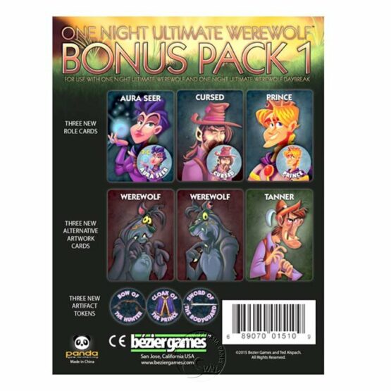 一夜終極狼人:獎勵包增加三位新角色,三個新的神器標識物,還有三個替換的美術身份牌,要搭配「一夜終極狼人」以及「一夜終極狼人:破曉」使用。