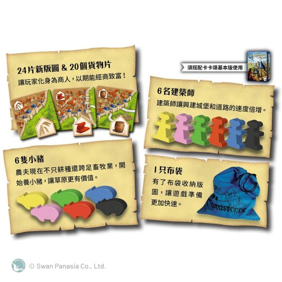 您可以將本擴充的部份或全部版圖加入2.0基本版來進行遊戲,您也可以依喜好同時搭配其他的擴充使用,進行一場獨特的卡卡頌體驗。