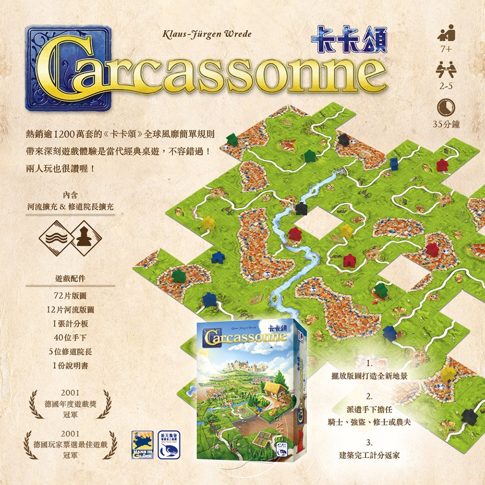 卡卡頌3.0與2.0兩者板塊美術設計相同可兼容遊玩;內含河流擴充與修道院長擴充,讓你玩樂更盡興!