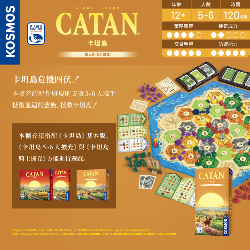 這是需與卡坦島基本版、卡坦島5-6人擴充、卡坦島騎士擴充搭配的擴充版,可將遊戲人數擴充至5-6人。