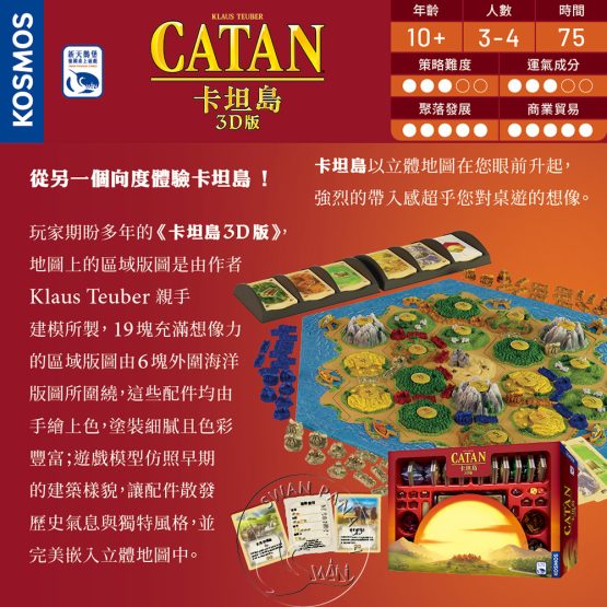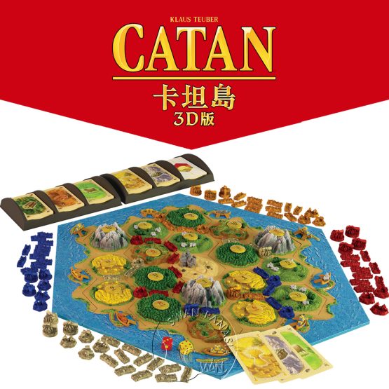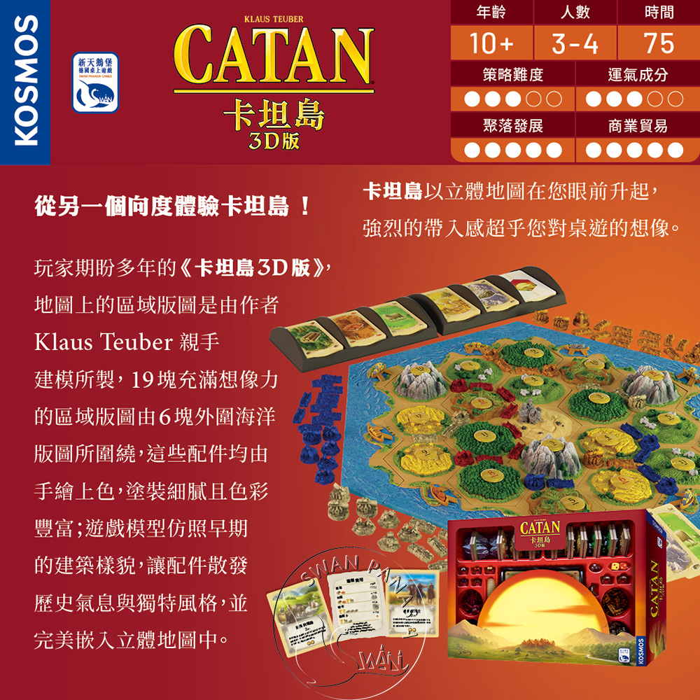玩家期盼多年的 《卡坦島3D版》 ,地圖上的區域版圖是由作者 Klaus Teuber 親手建模所製,19塊充滿想像力的區域版圖由6塊外圍海洋版圖所圍繞,這些配件均由手繪上色,塗裝細膩且色彩豐富︔遊戲模型仿照早期的建築樣貌,讓配件散發歷史氣息與獨特風格,並完美嵌入立體地圖中︒
