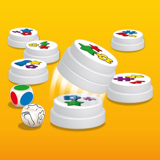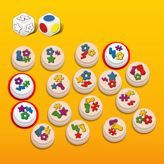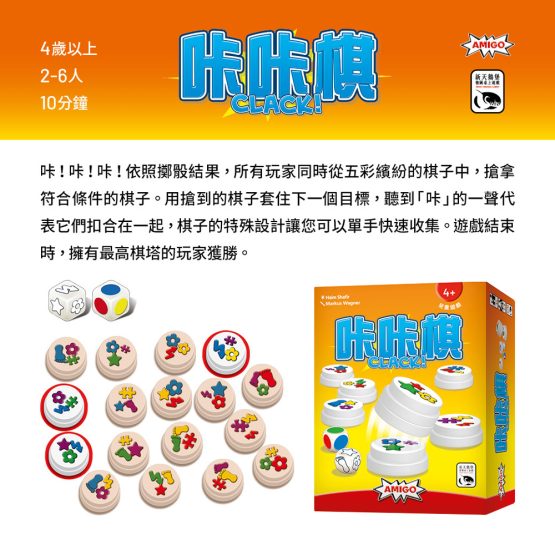 咔!咔!咔!依照擲骰結果,所有玩家同時從五彩繽紛的棋子中,搶拿符合條件的棋子。