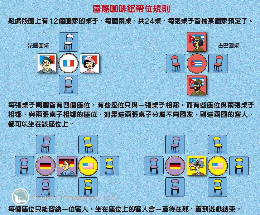 遊戲目的是盡你所能將客人拉攏進咖啡館,並將客人們按照遊戲規則帶位到圓桌區或是吧檯區。