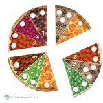 遊戲中共有 8 種口味的派,片數不等,但可組成 5 個完整的派,各含 11 片,每種口味帶來的分數不同。
