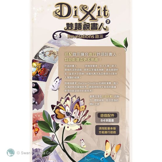 本擴充再次為您帶來84張令人驚艷的紙牌。隨著插畫家 Marina Coudray的細緻筆觸,進入充滿詩意的優雅世界,透過她明亮又柔和的圖畫,帶領你遨遊奇妙的新視界!盡情沈浸在妙語說書人的魅力,體驗嶄新、超乎想像的 精彩之旅……