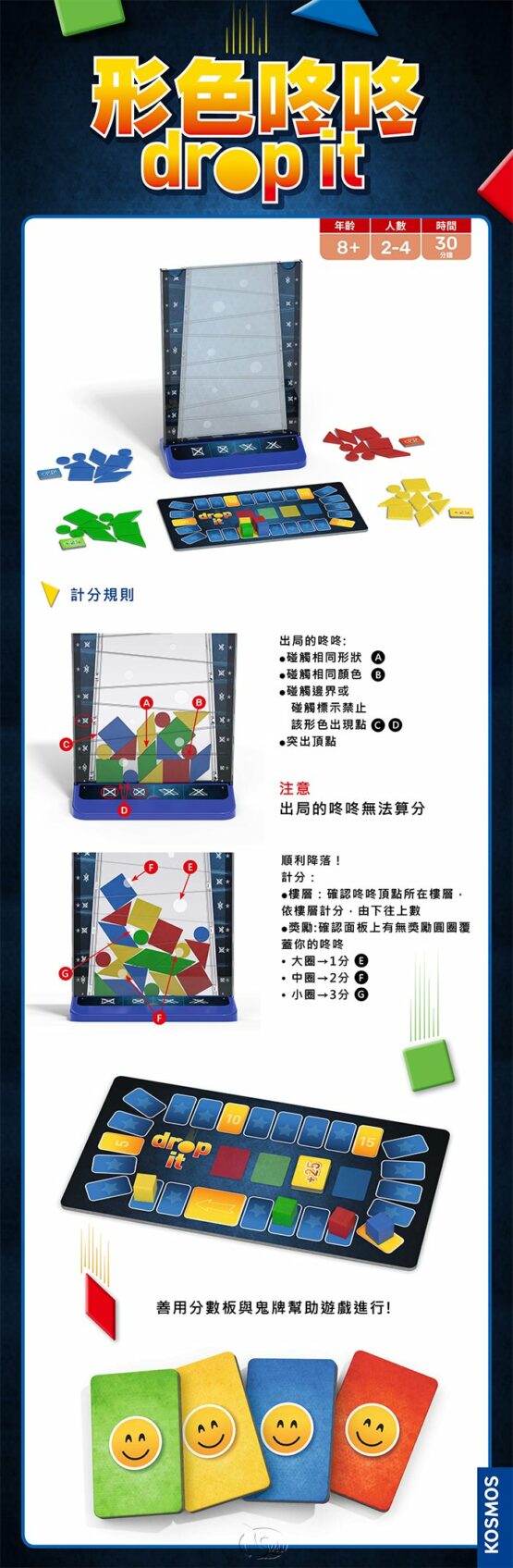 請小心:切勿違反降落規則!你投入的咚咚不能碰到其他形狀 或顏色相同的咚咚。若違反降落規則,你將空手而歸。