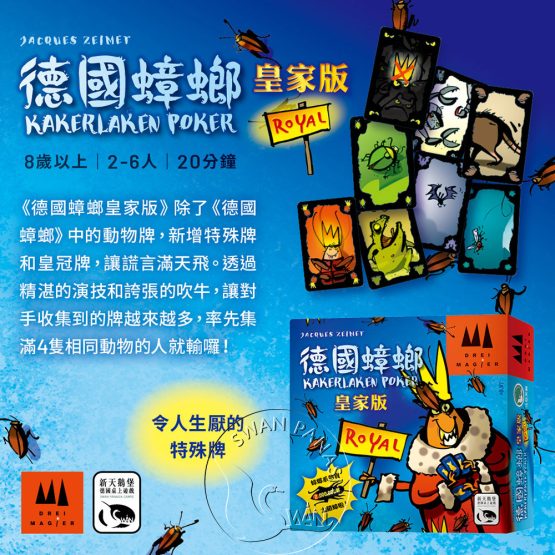《德國蟑螂皇家版》除了《德國蟑螂》中的動物牌,新增特殊牌和皇冠牌,讓謊言滿天飛。