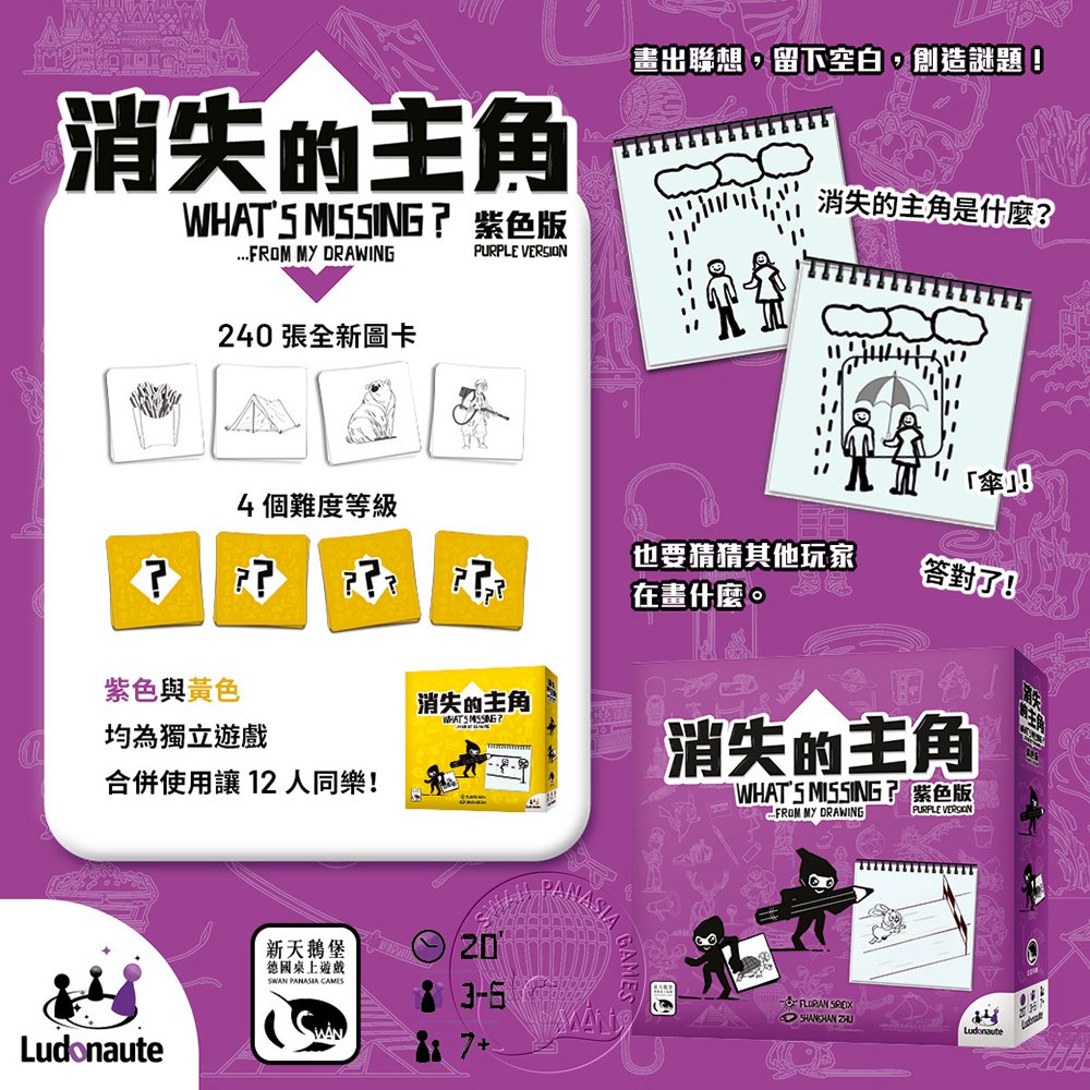 若您擁有消失的主角黃色版,可與紫色版合併使用,讓12名畫家一起遊戲喔~
