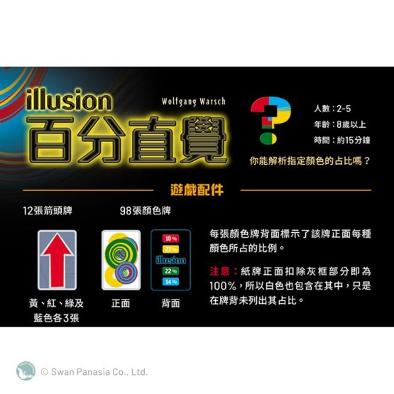 箭頭牌的顏色為本輪的指定顏色,桌面上所有的牌必須依該色在牌上所占的 百分比升冪排列。