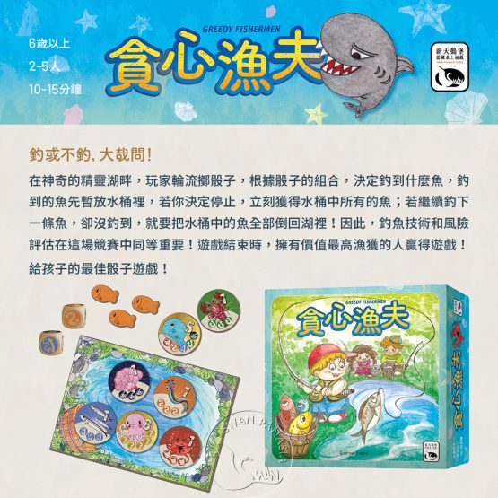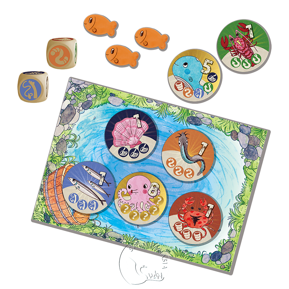 在神奇的精靈湖畔,玩家輪流擲骰子,根據骰子的組合,決定釣到什麼魚,釣到的魚先暫放水桶裡,若你決定停止,立刻獲得水桶中所有的魚;