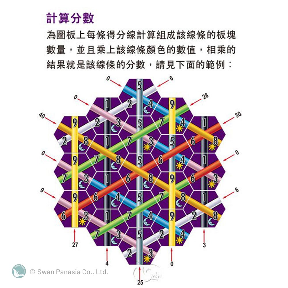 ■全部板塊放完之後為自己圖板上三個方向的每一條單色線計分。