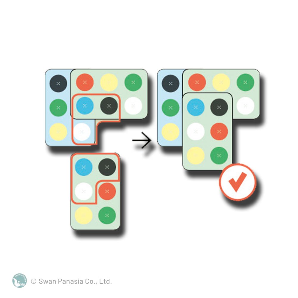 玩家要儘快將自己的紙牌上至少兩個紐扣疊合在桌上就有的同色紐扣上,