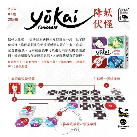 這是一款合作遊戲,玩家在遊戲中可以進行有限度的資訊溝通,透過團隊合作並運用記憶,才能降伏所有的妖怪!