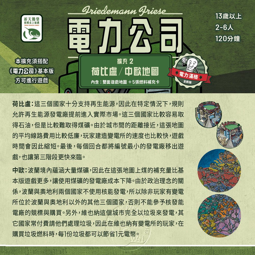 本擴充荷比盧/中歐擴充須搭配《電力公司》基本版(新版舊版均適用)方可進行遊戲。