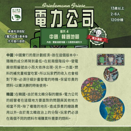 本擴充中國/韓國擴充須搭配《電力公司》基本版(新版舊版均適用)方可進行遊戲。