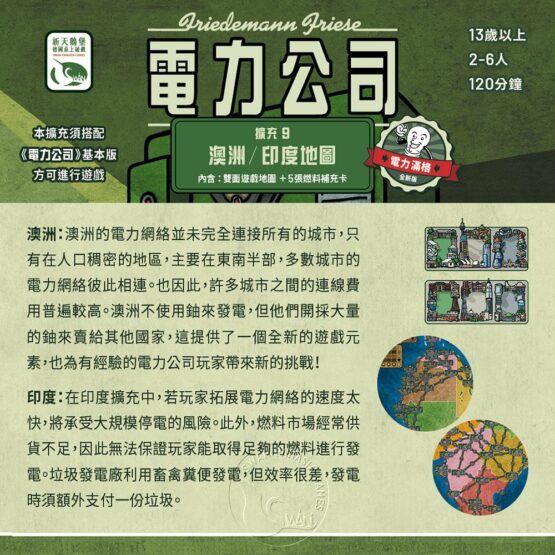本擴充澳洲/印度擴充須搭配《電力公司》基本版(新版舊版均適用)方可進行遊戲。