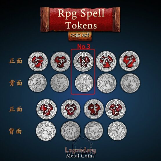 我們在金屬硬幣上鑲入紅色琺瑯,讓您可以使用彩色面作為活動面,背面作為已使用面,以便輕鬆追踪您已施放的法術和仍然可用的法術。