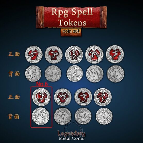 我們在金屬硬幣上鑲入紅色琺瑯,讓您可以使用彩色面作為活動面,背面作為已使用面,以便輕鬆追踪您已施放的法術和仍然可用的法術。