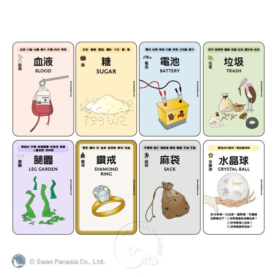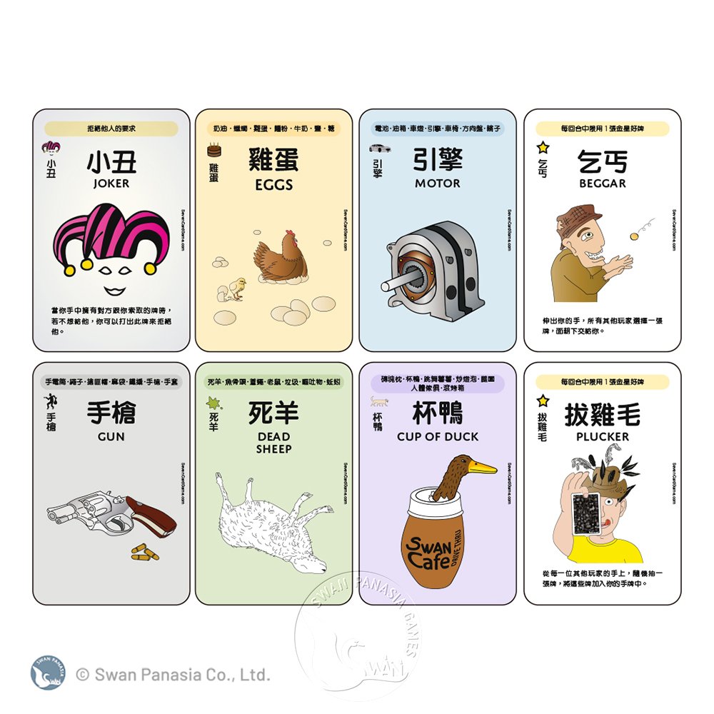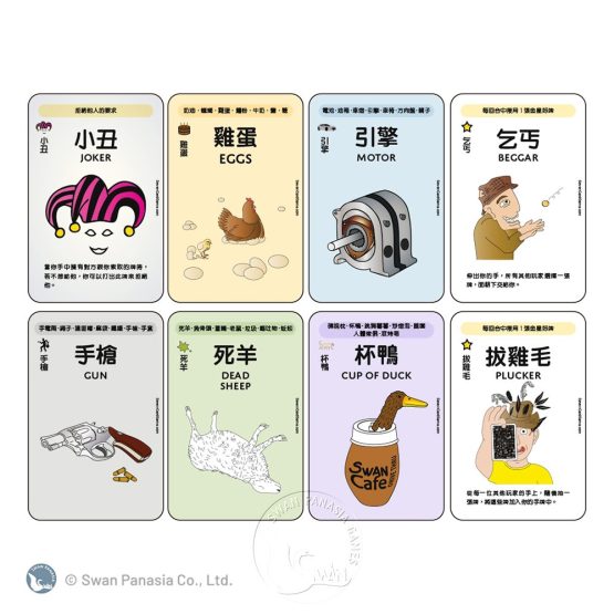 除了七組不同類別的紙牌外,還有4張小丑牌、14張金星好牌和3張黑星壞牌,